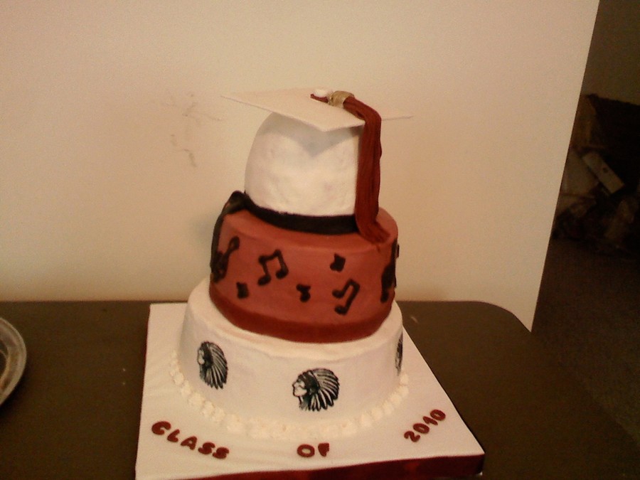 Sorry about crooked picture, Bottom tier chocolate with white chocolate filling, middle is chocolate with peanut butter filling and top is white chocolate with chocolate hazelnut filling. Musical notes are chocolate. Tassel ,ribbon, and karate belt are fondant. Edible image on bottom. First time stacking 3 tiers.