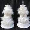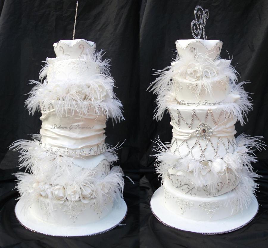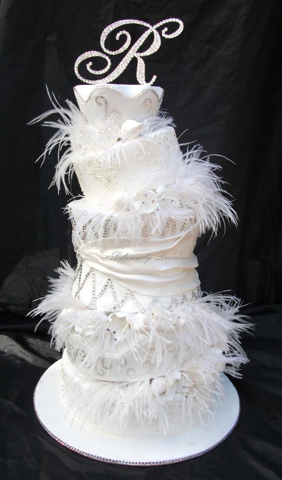 my ode to sex and the city, dummy for a photo shoot fondant covered with unedible crystals, gumpaste flowers and ostrich feathers