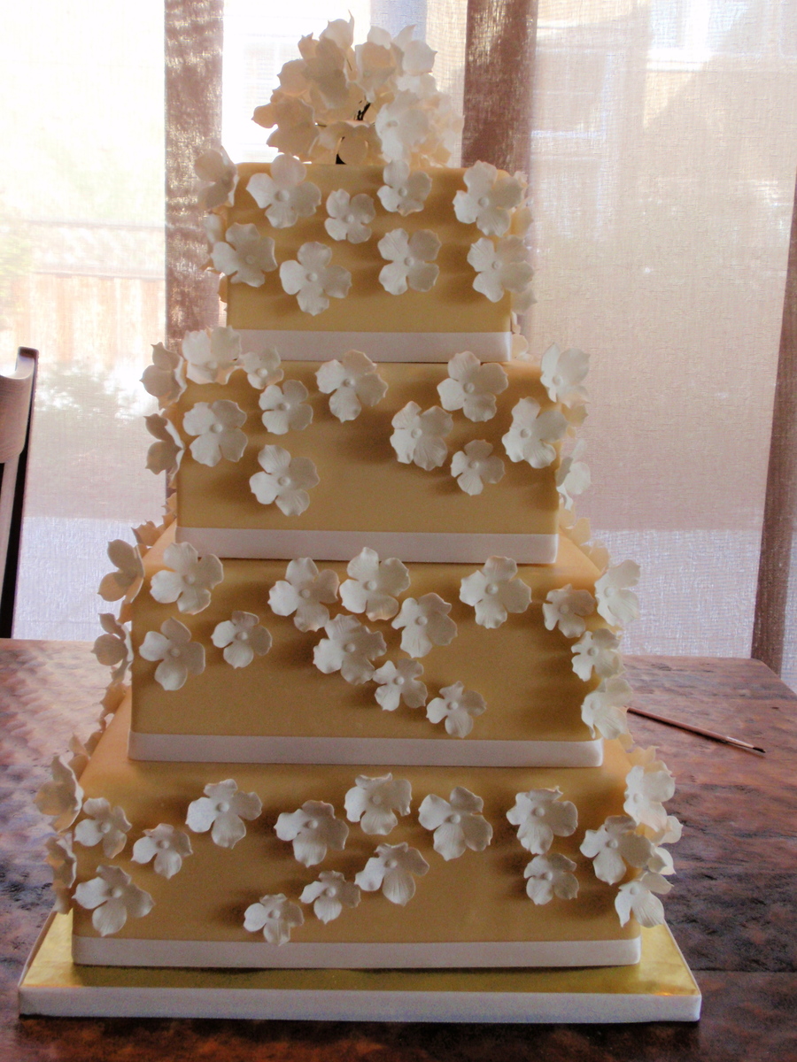 6,8,10 and 12 inch square cake. Color should be ivory but it turned out more of a peach color. 6 and 8 are lighter than the 10 and 12. I guess I need to practice more in coloring the fondant. These are dummy cakes.