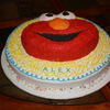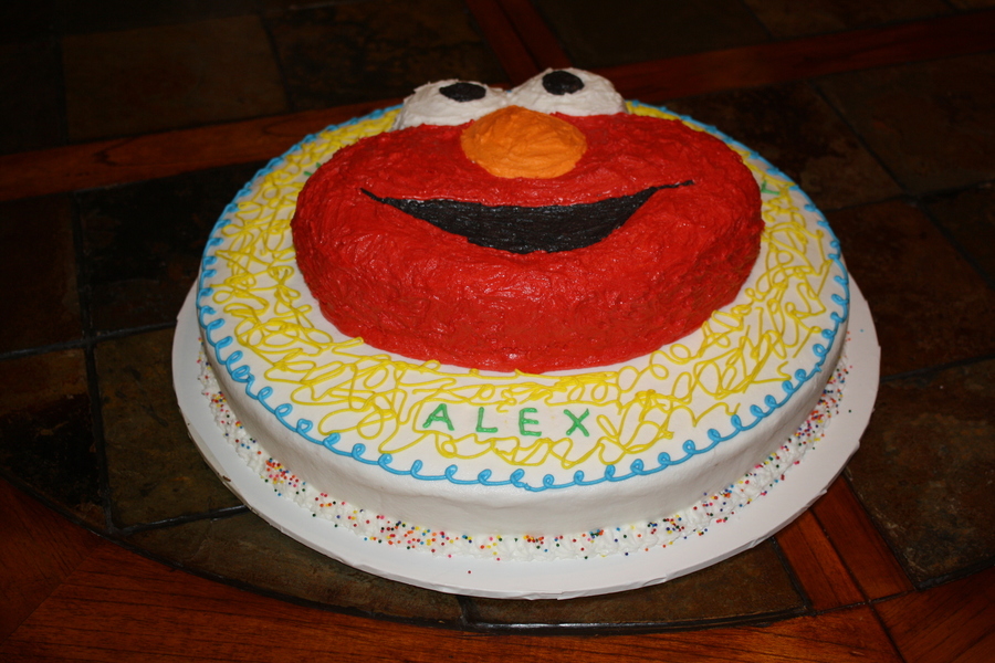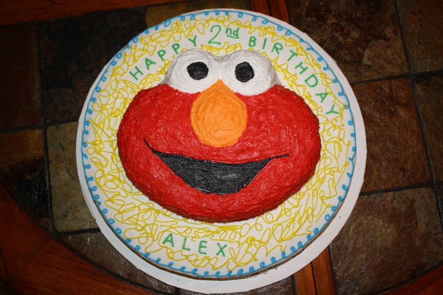 Made this for my son's 2nd birthday. Elmo character pan on top of a 16" round cake.