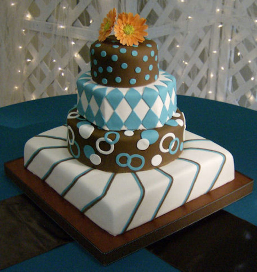 Design was created by bride and groom. Fondant covered with fondant accents. Hand-made cake stand. Also, hand-made gumpaste gerber daisies on top.