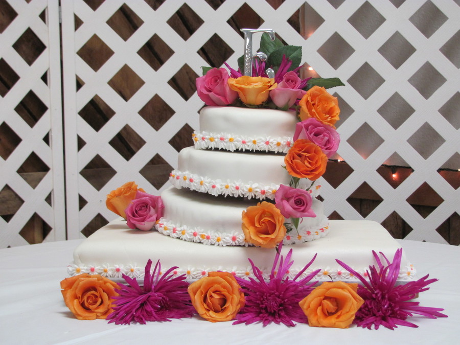 This is the very first wedding cake I have ever done. It's Fuschia and Orange themed. I know I messed up on the second and third layer with the spacing but other than that I like it. (: Tell me what you all think please...I need advise and suggestions. Thanks!!!