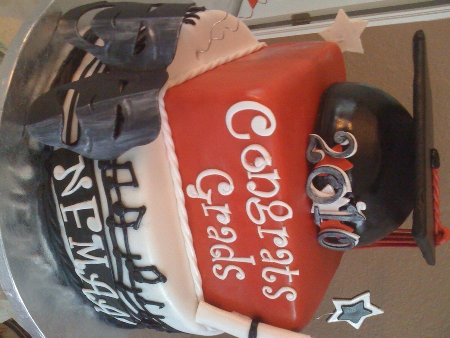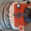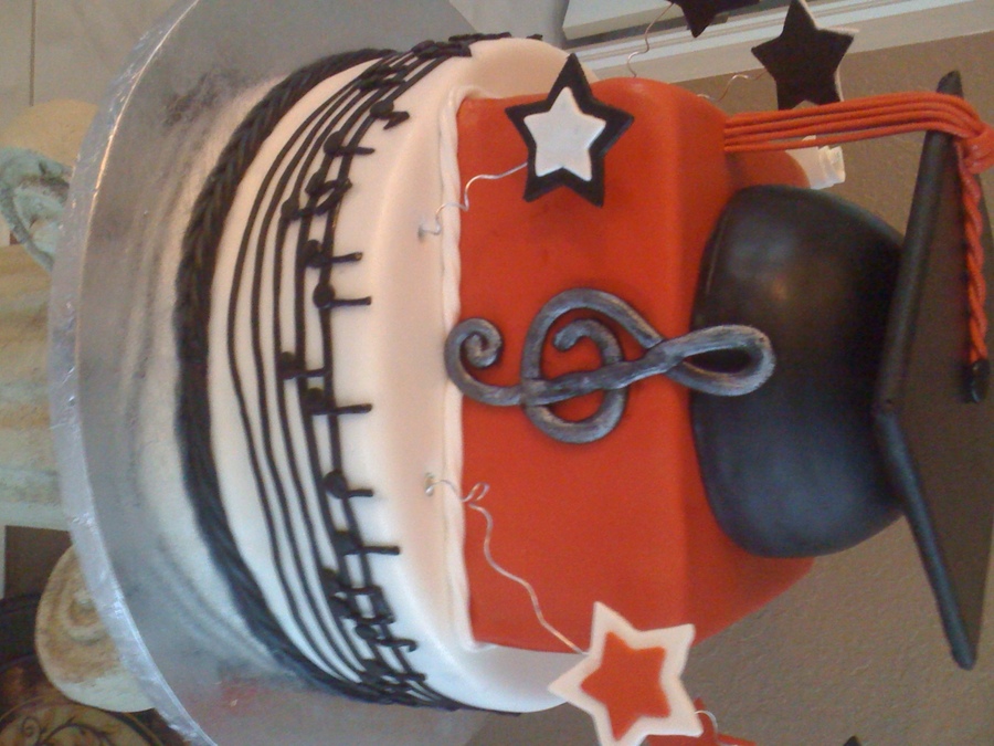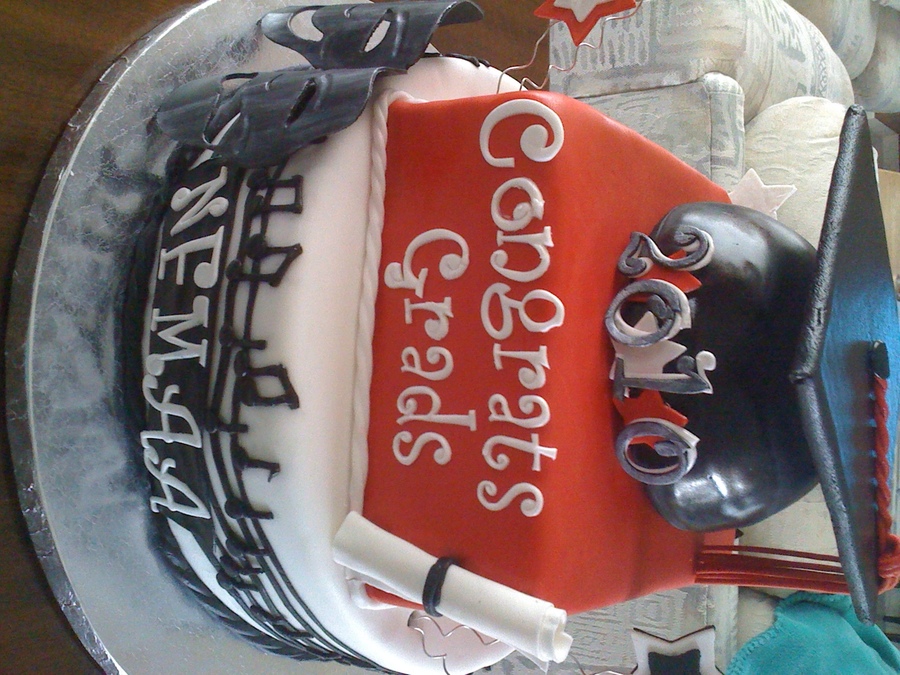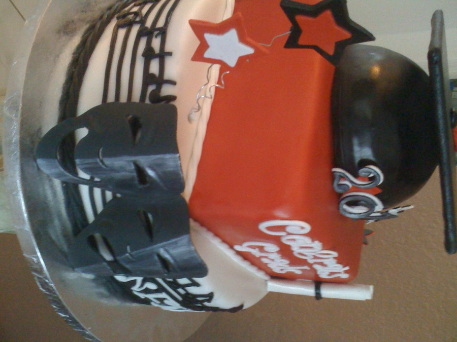 This cake was made for a group of middle school grads from an Academy of the Arts. The theme of the cake was for music, dance and drama all done in school colors. Top two tiers are marble cake with white chocolate buttercream and thd bottom tier is one layer white cake and one layer chocolate cake with both white chocolate and milk chocolate buttercream fillings. Completely edible decorations made from gumpaste. TFL!!