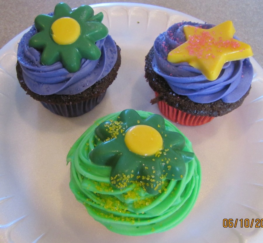 Made these cupcakes for end of school party! Cupcakes are chocolate mud and vanilla ricotta cake with Buttercreme frosting and chocolate mold flower and star toppers. Thanks for looking.