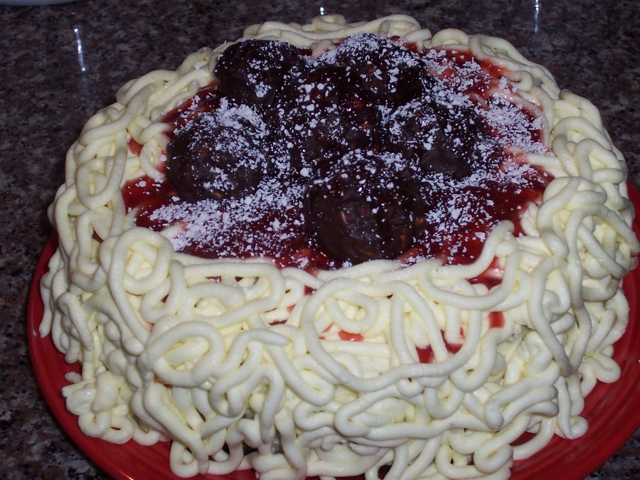 Made this cake for a friend of mine who was having a spaghetti potluck at work. Lots of fun to make. Meatballs are RKT covered in chocolate, cheese on top is grated whit chocolate and sauce is strawberry preserves. Chocolate cake with buttercream noodles. TFL!