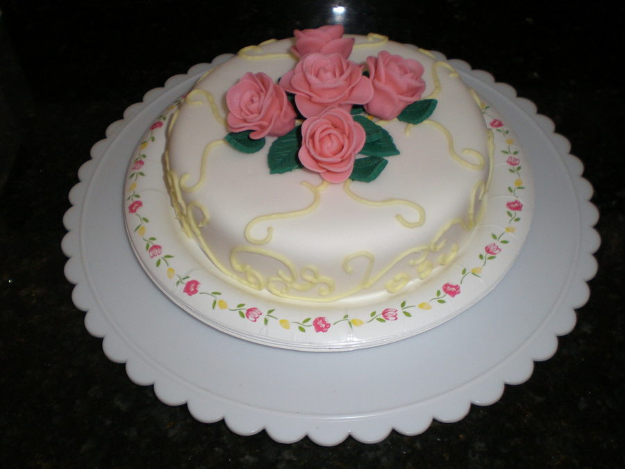 Two layer lemon cake with organic strawberry filling and lemon butter cream icing. Cake is covered in fondant with fontand roses and leaves. Yellow lace detail done in buttercream.