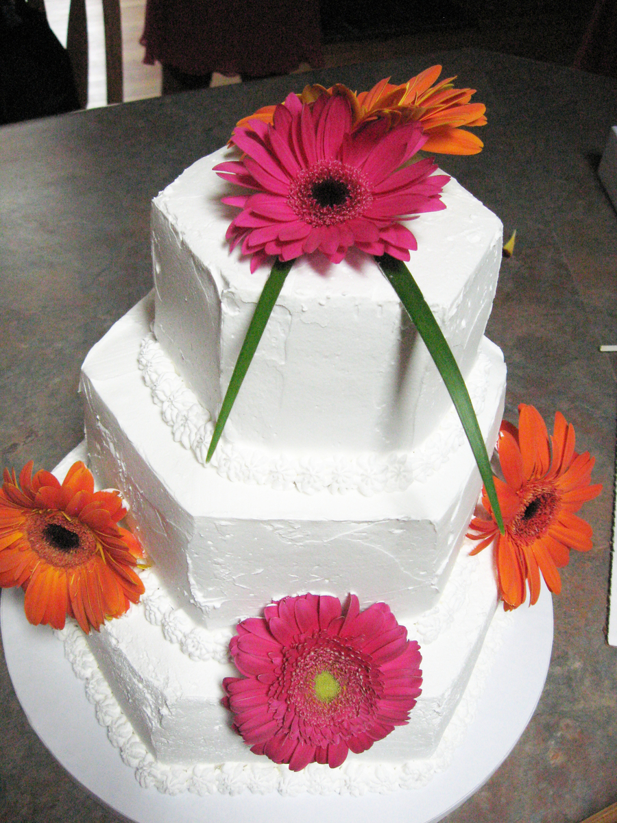 This cake was planned then I had to change it when I got there. It was for my cousin. She got the flowers and also was going to have ribbon to go around each layer. When I got there she didn't have the ribbon and only had these huge flowers for the cake so I had to improvise.