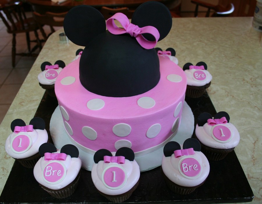 Done for a little girl's 1st bday. All buttercream with fondant/gumpaste decor. Minnie Mouse head is styrofoam covered in fondant.