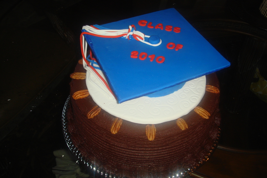 German Chocolate Cake with coconut pecan filling. Covered in Chocolate Ganache and decorated with fondant graduation cap.