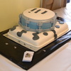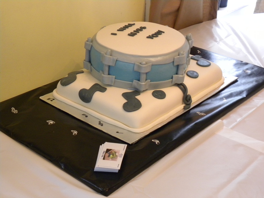 Cake for my Band and their families. Bottom: Gold cake with buttercream and strawberry buttercream filling. Drum: Chocolate cake with peanut butter buttercream frosting. All covered in MMF.