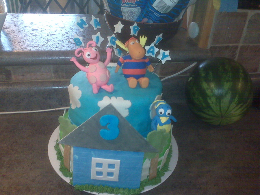 Backyardigans cake. Gumpaste house, trees and figures. My first time make figures out of gumpaste...not too bad for my first time.