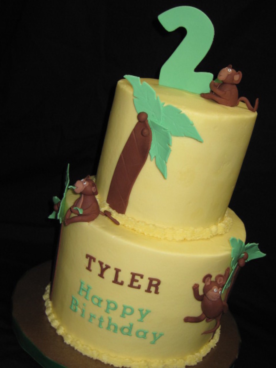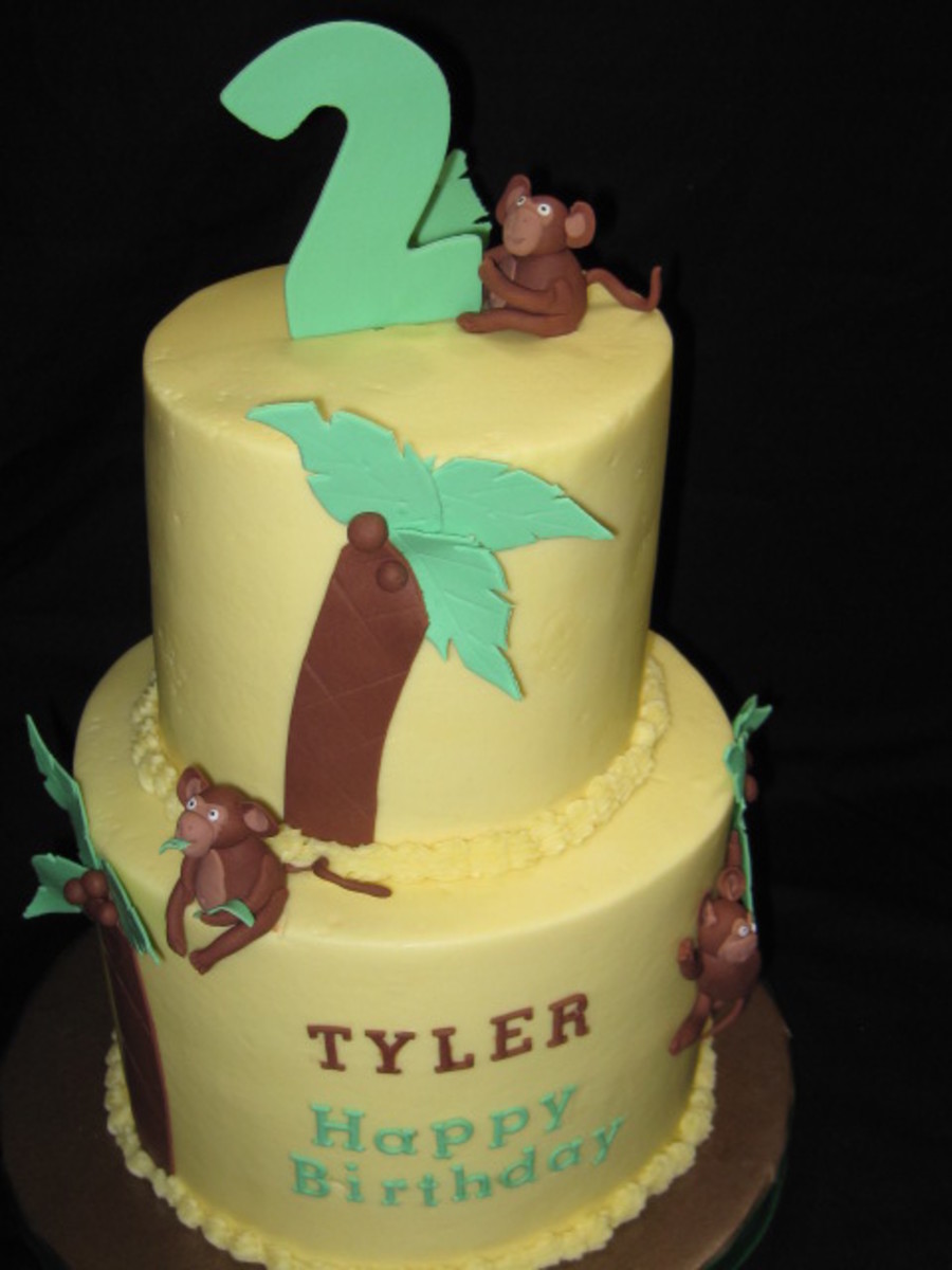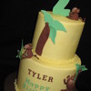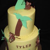 I totally stole Sugarshacks' cake style design here, but it matched the invtitation perfectly!! (Thanks Sharon!) The cake is buttercream, the accents and monkeys are fondant with tylose. Fun cake!