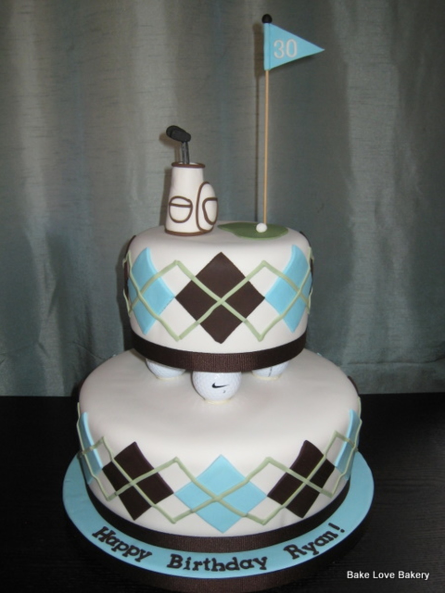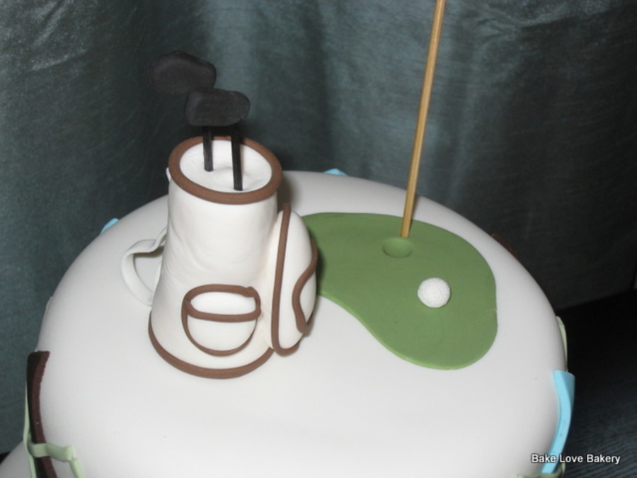 The original design for this cake is not my own...my client sent me a pic, but I don't know whose it is, so I can't give proper credit. This cake is very close to the original pic, with a few of my own changes. The bottom was chocolate with cookies and cream filling, vanilla buttercream. The top was vanilla cake, caramel filling, vanilla buttercream. Cake was covered in fondant - all accents were made out of fondant/gumpaste. The birthday boy was turning 30, hence the 30 on the flag. The golf balls separating the cakes are real.