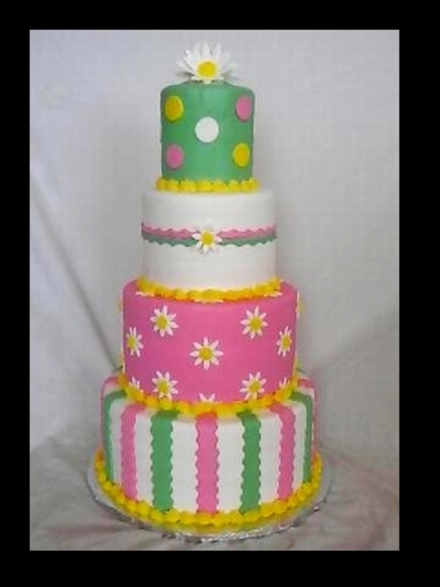 The sizes are 4"-6"-8"-10". This cake was made for a first birthday party. I really loved this cake, I was extremely happy with how it turned out. Cakes are covered in MMF and have airbrushed MMF accents. The 3-D daisies are made of gumpaste. Serves 80 at $2 dollars per serving + $5 for daisies = $165.00 Mark-Mexicano