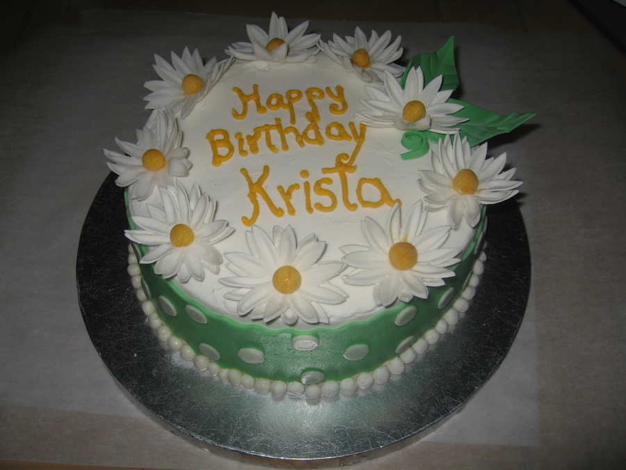 Chocolate cake with strawberries n cream filling; covered with MMF and gumpaste/fondant daisies.