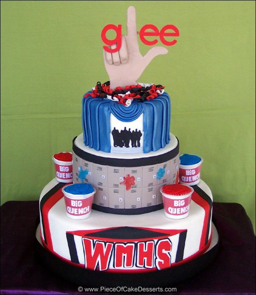Covered in fondant with cupcakes in the slushie cups. The glee logo and hand were gumpaste and the logo, WMHS letters, and silhouette was cut out with the Cricut cake.