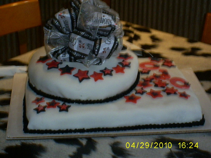Cake was done for my sister in laws high school graduation. School colors were used (black and red). Made the bow in the top of the cake.