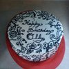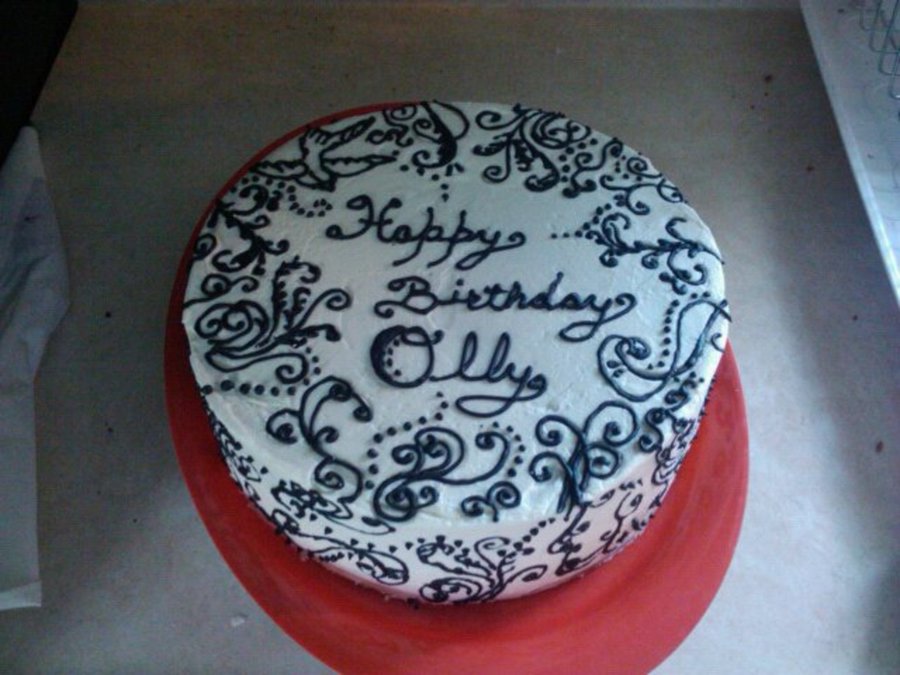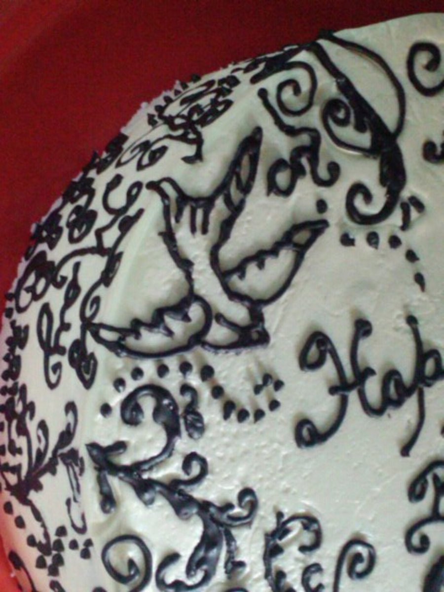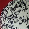A cake for my friend's May 8th birthday. White cake, vanilla bean butter cream filled with fresh strawberries. Piping is black royal icing darkened with dutch cocoa powder.