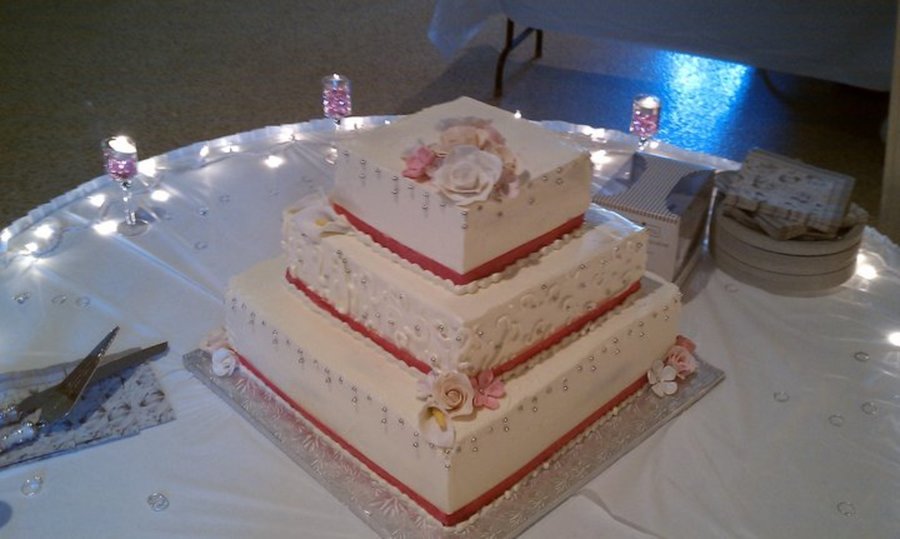 Square wedding cake, white cake with italian buttercream. Decorated with pink ribbon, gumpaste flowers and silver sugar pearls.