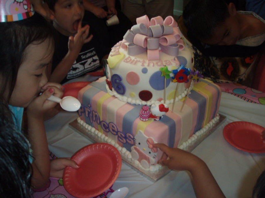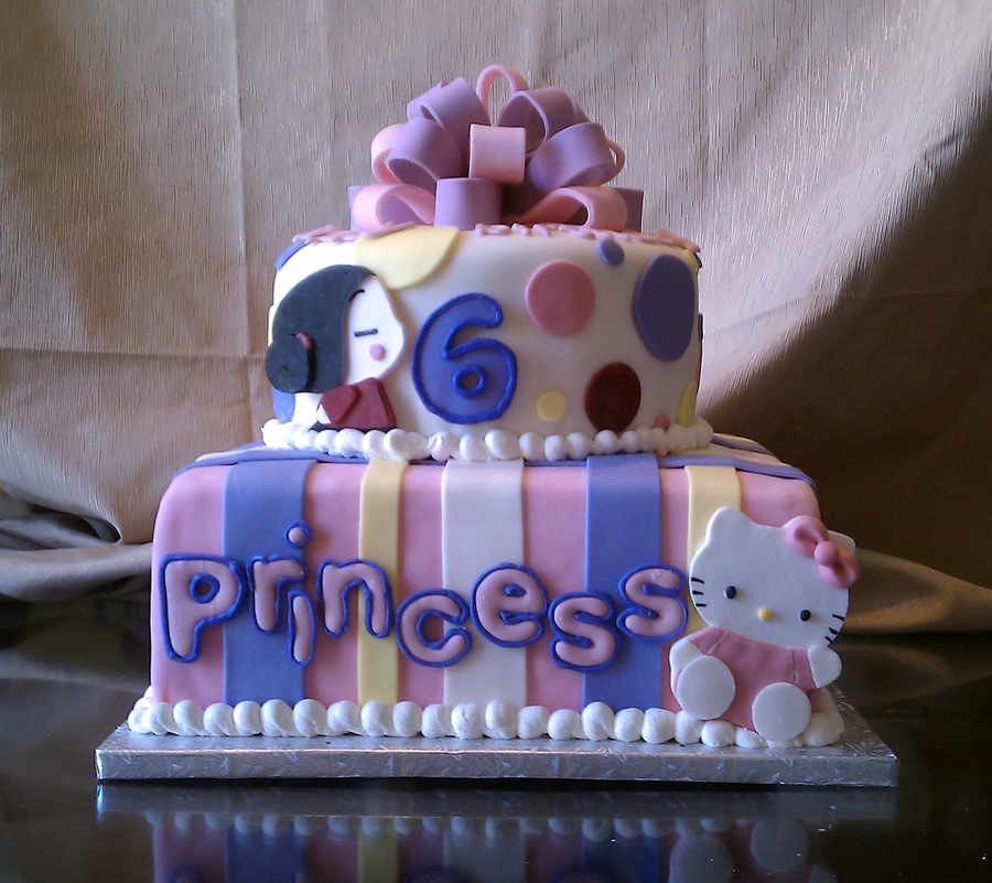 A Birthday Cake I did for my niece's 6th birthday since her favorite characters are Hello Kitty and Pucca. Chocolate & Vanilla Cake filled and crumbcoated with Frostin' Pride. Entire cake covered and decorated with Michelle Foster's fondant recipe.