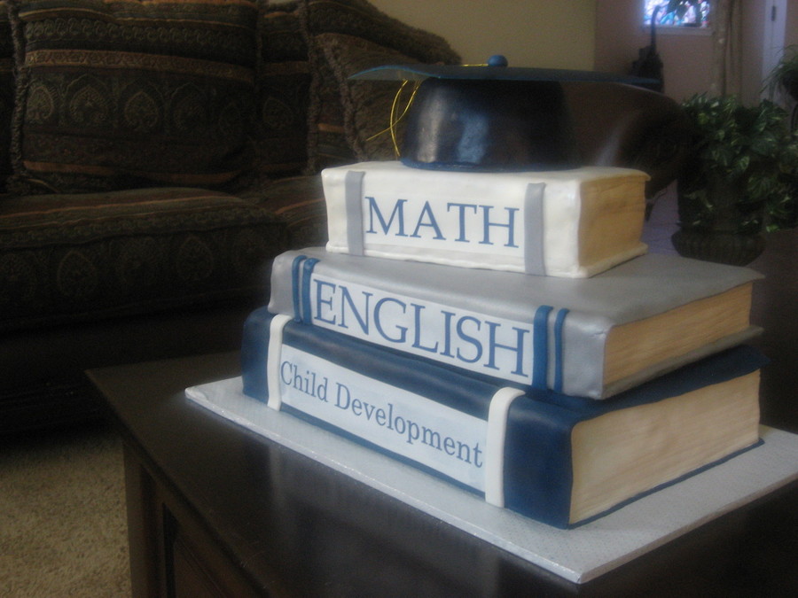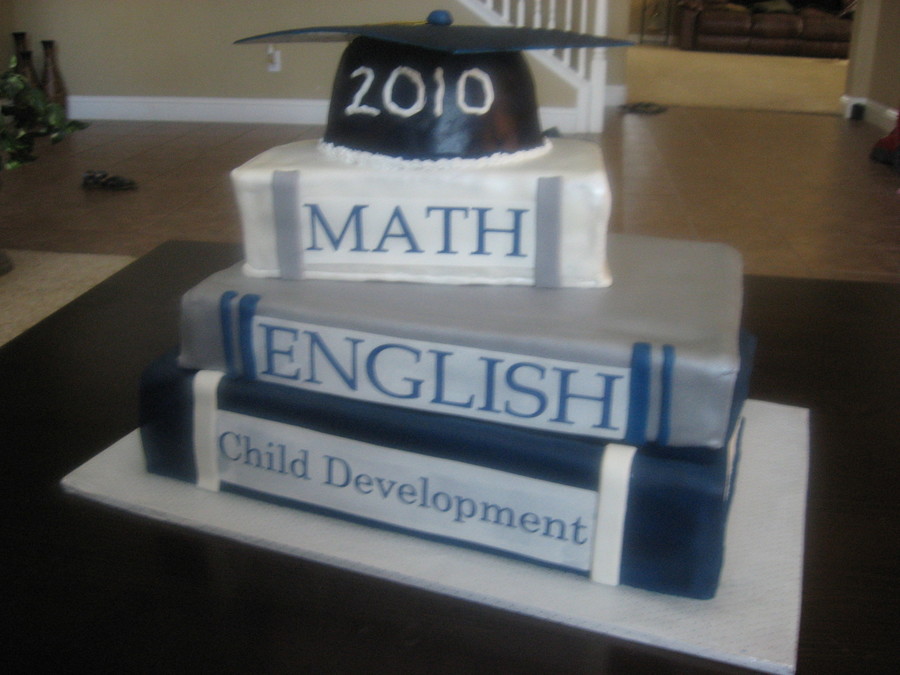 My first attempt to stacked book cake it is a 10x15 bottom,9x13 middle,9x13 cut in half then stacked,grad cap is made from round glass bowl.Would like to thank Peggyslee for your wounderful support.You are awsome. Thank you to blakescakes,leah_s,awatterson for your tips.