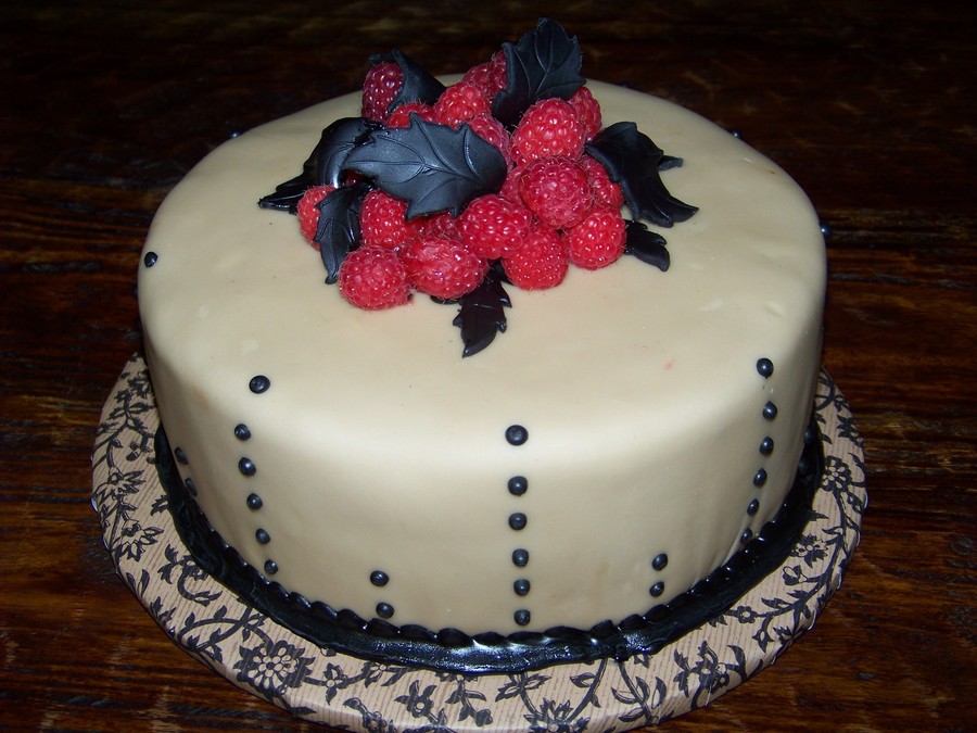Mocha Cake with Raspberry filling. Mocha fondant and fresh raspberries with royal icing detail.