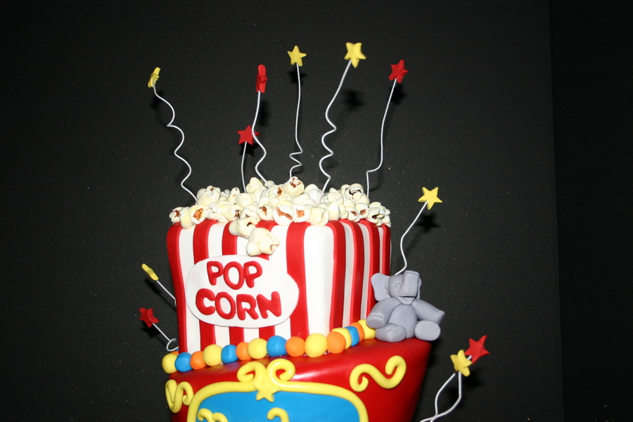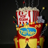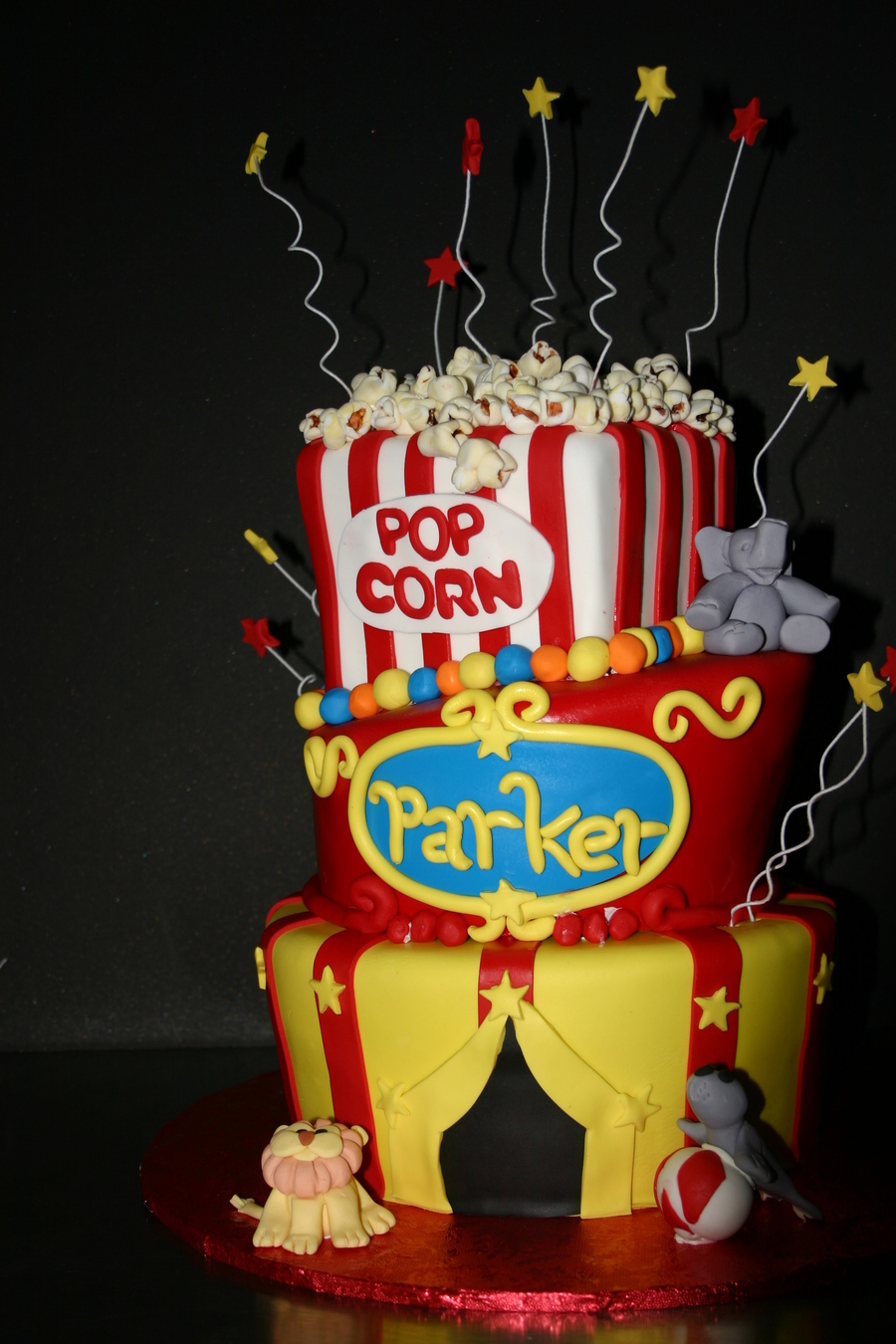 This was a snickerdoodle cake and Red Velvet cake that was covered in MMF the Pop Corn was also made from MMF the animals are Gum Paste