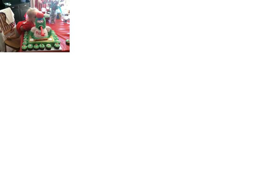 This was for my niece's daughters first birthday which was a Phillies tailgate theme. We are a big family of Philiadelphia sports teams. 12x3 chocolate cake for the baseball field airbrushed in green. The bases are fondant and the baselines are graham crackers. Vanilla cupcakes with sugar accents. The Phanatic's body is chocolate cake and the head, arms, and hat are rice krispie. Jersey was made from fondant and the hat was covered in fondant as well. The most awesome part of the cake is the fact that inside the "cone" shaped beak is a working tounge as you can see in the second picture. The birthday girl's sister was happy to make it work. Lot's of fun making this cake :)
