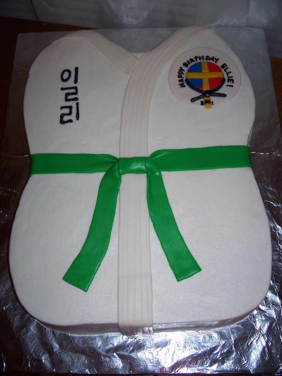 Inspired by several cakes here on CC...thanks! This was a really fun cake to make and I was so happy with how it turned out. I iced it with BC and added fondant accents. The birthday girl's mom had supplied me with pictures of her karate shirt so I could copy the emblem and her name.
