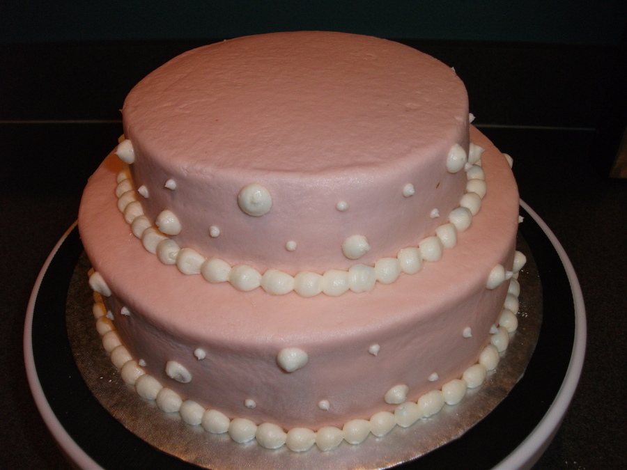 1-8" vanilla cake and 1-6" vanilla cake filled with Strawberry Mousee and covered with White Chocolate BC. Borders and dots are pina colada BC