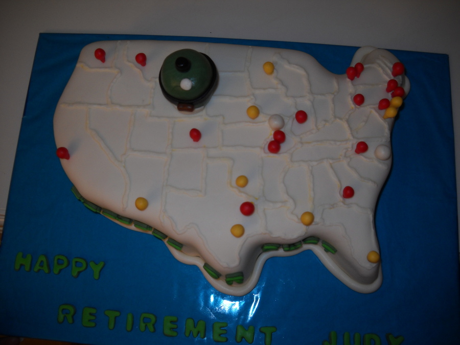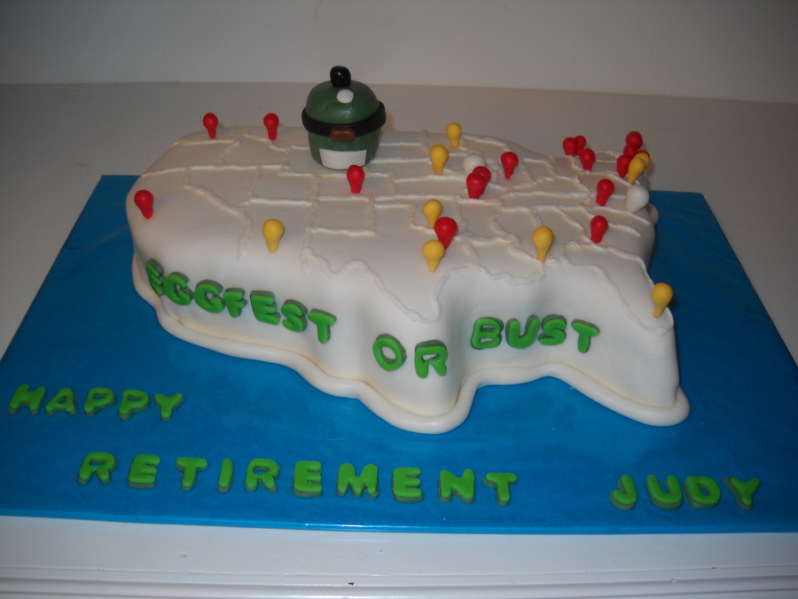 The Ceramic Egg Grill owners apparently travel to meet up and grill together. This client was retiring and she and her husband were going on the grill tour. The map markers indicated locations of meetings. She loved it. I love customized cakes!
