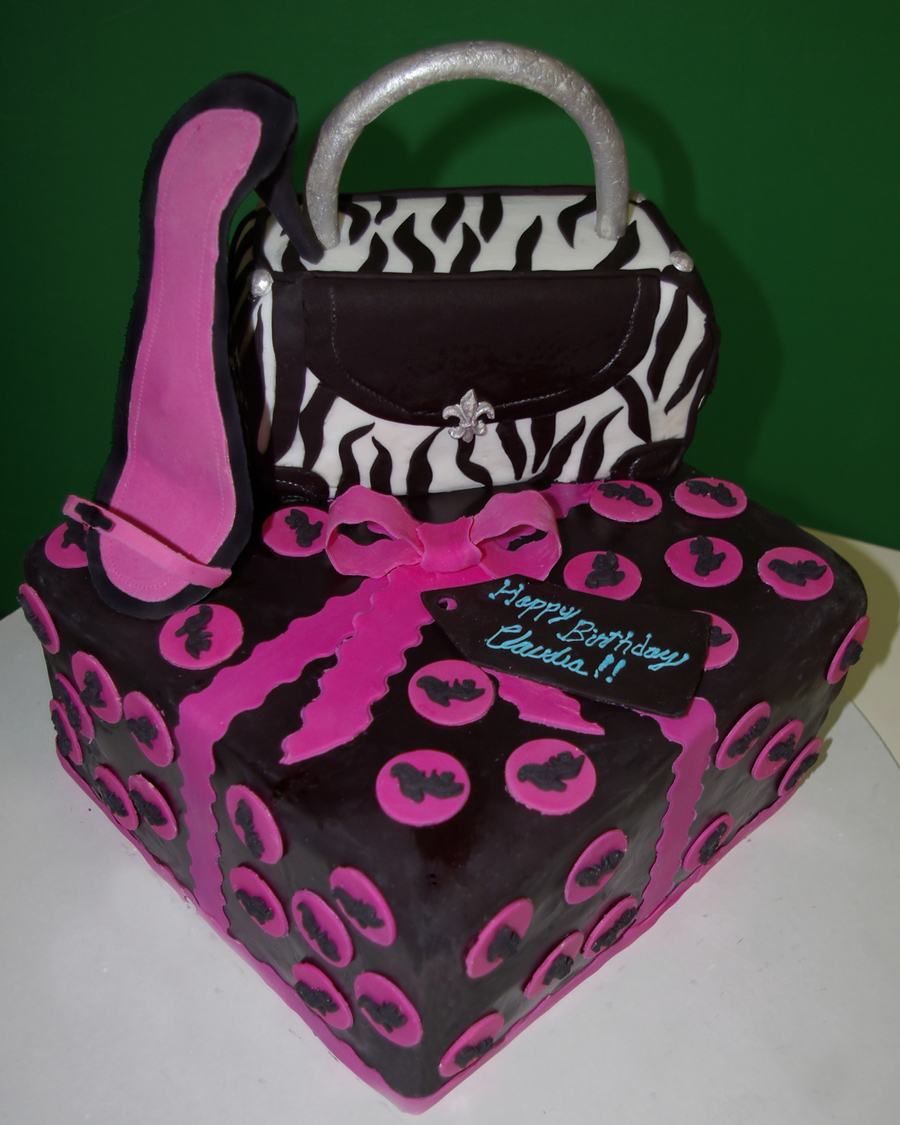 Present is chocolate cake with peanut butter flavored filling covered with black fondant and fondant circles with gumpaste vintage black shoes. Purse cake is carrot cake with a buttercream filling with gumpaste decorations. Shoe is made out of gumpaste.
