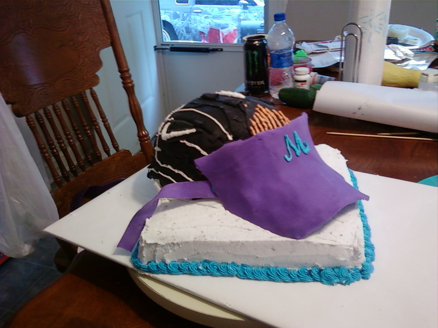 this is a cke I did for my daughter softball team's party it has their visor, her glove, and a base. the girls loved it. I used a real visor covered in plastic to form the visor with fondant, I did it about 4 days in advance. the glove is a half ball covered in fondant and shaped to look like a glove. the base is white buttercream. I got the idea from some of CC members. but colors are from her team