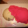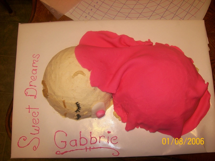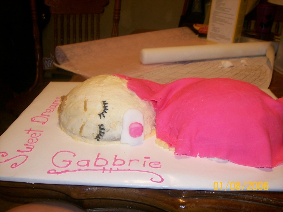 2half ball cakes covered in buttercream, blanket is fondant can't see it has flower pattern on it.