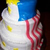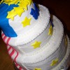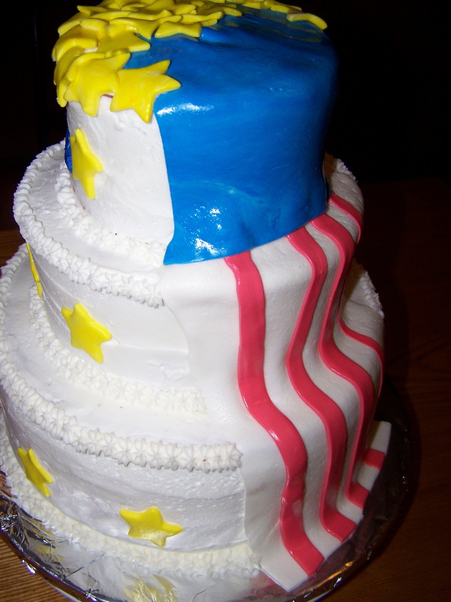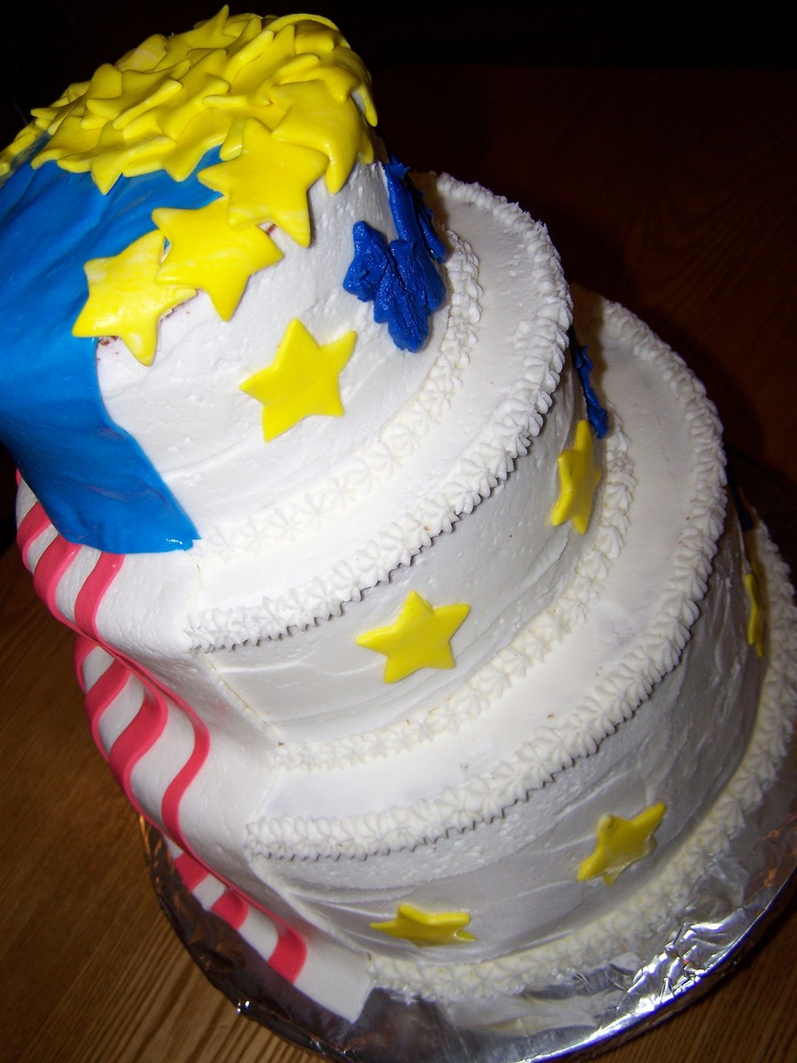 a friends husband was returning home from Iraq- this was his cake at his welcome home party. three tier vanilla cake with buttercream icing. flag and stars are made of mmf.