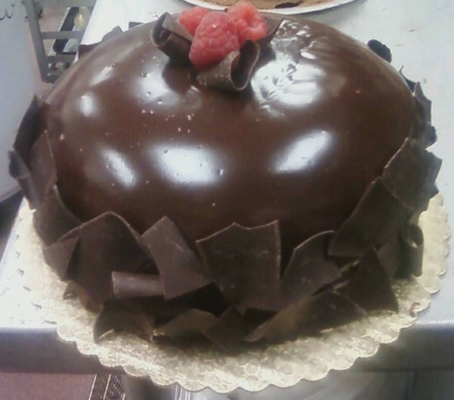 chocolate cake with raspberry filing, choc bc icing and melted choc covered, choc shaving