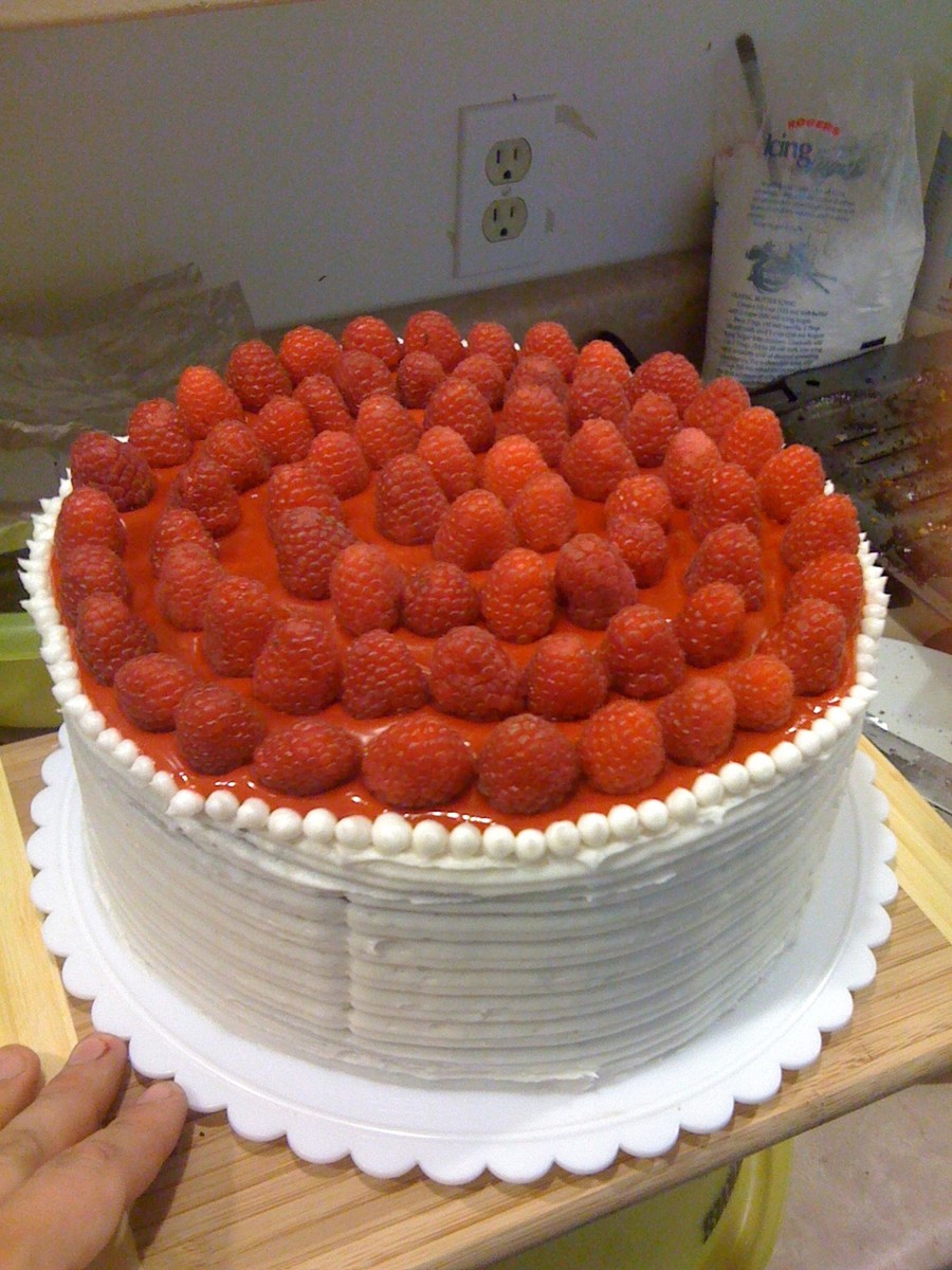 It wasn't a very well done cake because I cut the top of crooked which made it incredibly difficult to pipe those little pearls on the top. Also, I was trying to ice the cake while it was still warm... and you know what bad things that heat does to icing.