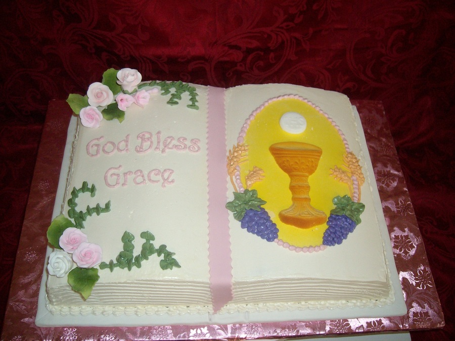 Italian buttercream with fondant accents and pressed sugar chalice and host. Flowers are gumpaste
