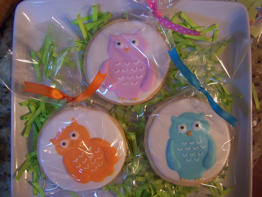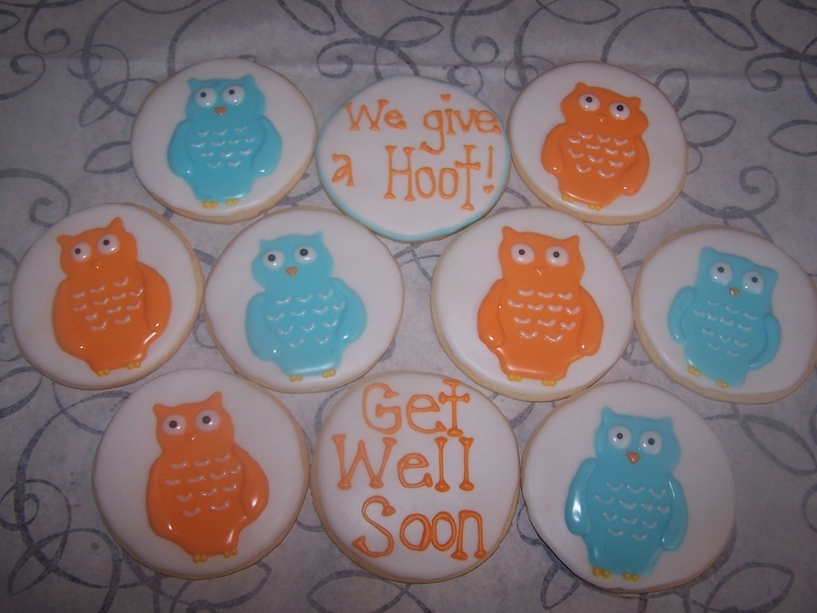 I found these cute owl cookies that were cutouts on another website. I thought they were so cute that I decided to do them freehand on circle cookies. They make me smile! I did some for a friend who just had surgery and made a "We give a HOOT!" cookie to go with them!