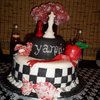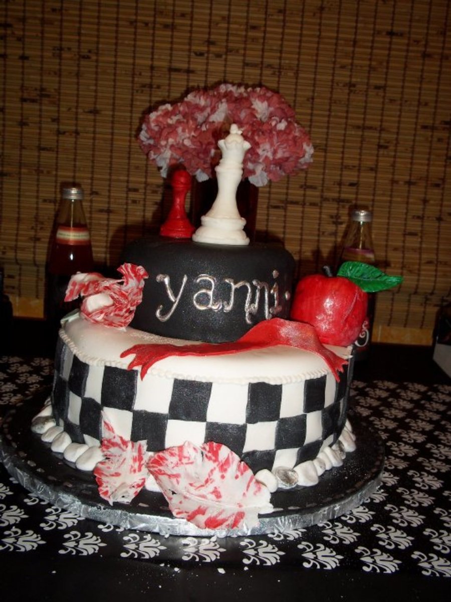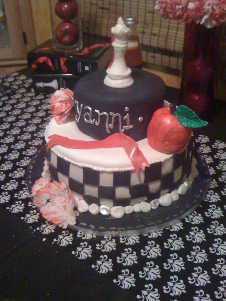 Inspired by other Twilight-themed cakes here on CC, this cake was for a really cool quinceañera. Info: Bottom layer was a Devil's Food (super chocolate) cake and the top layer was my Very Vanilla Pudding Cake. High-humidity buttercream covered with fondant (it's just too hot & humid in South Florida during the summer!). Everything is edible. I made the chess pieces and ribbon from Satin Ice fondant and used gum paste for the flower petals and apple. The apple was tinted red before hand molding it and was painted with coloring & vodka afterward to give it a different texture. Royal icing was used for piping work and to put everything together.