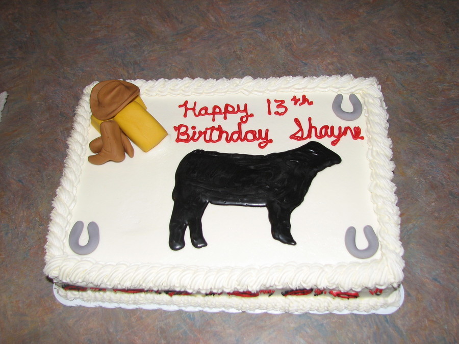 WASC with buttercream frosting. My niece shows steers in 4-H and wanted her Black Angus on her cake this year. It is a chocolate transfer. The hay bales, boots, hat and horseshoes are fondant. There is a handkerchief design on the side.