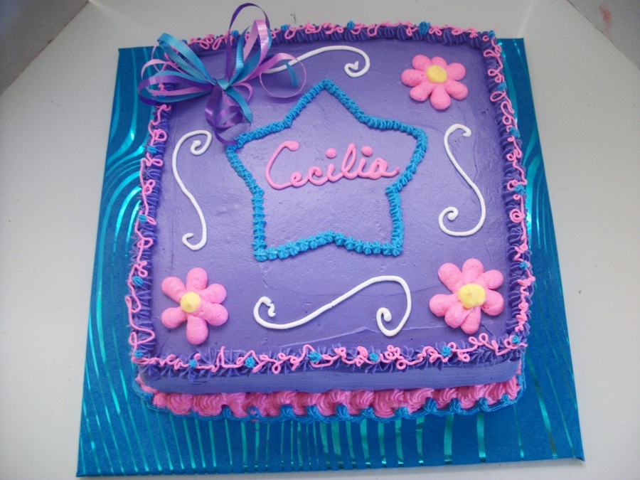 Made this cake for a little girl who wanted a purple cake and Hanna Montana-like colors and had to have some pink flowers. This was my interpretation of her request. She absolutely loved it. So did her mom.