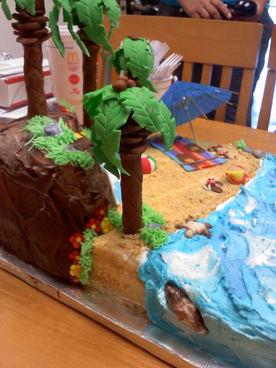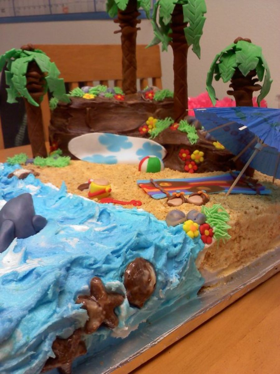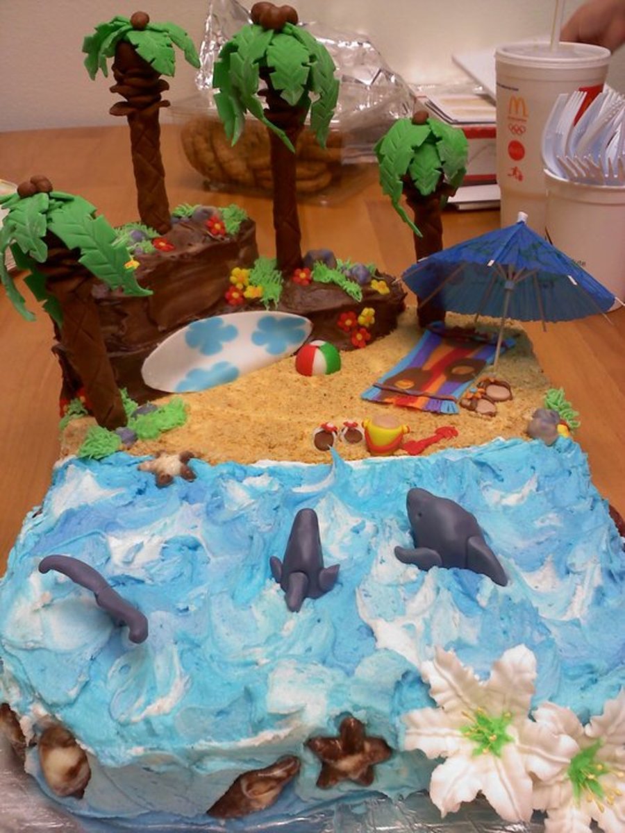 I made this cake for a girl at work that is moving to Hawaii, Thanks to all the CC members and their cakes i got some great ideas. I made her favorite cake which was confetti cake with buttercream filling and frosting ana fondant and gumpaste decorations. My surf board got a little wilty, i should have put it on when i delivered it., the palm trees were sesame bread sticks and the large one is a large pretzel.... This was my first cake that i made for someone else!! Thanks to yall for the ideas and TFL.....Kari