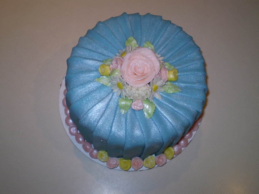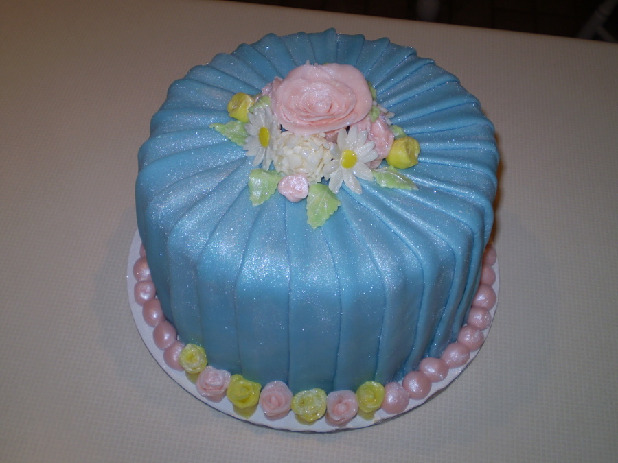 Cake for my Mom's Birthday/Father's Day It's lemon cake with raspberry filling covered with Bettercreme and lemon MMF. I really wanted to try a pleated cake after reading about how to do it in one of the forums. :-)