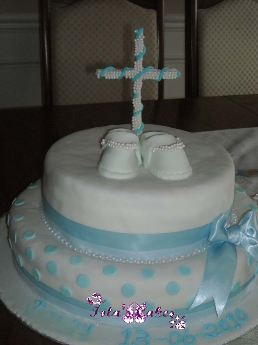 this cake was covered in fondant and the cross is made of gum paste and edible pearls
