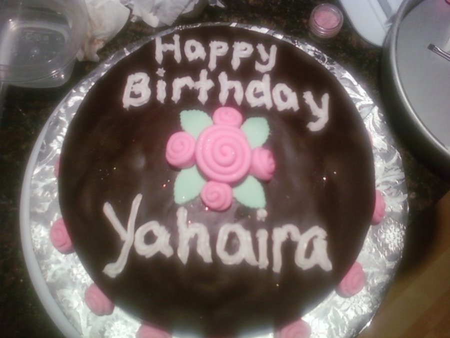 Chocolate cake with Caramel Swiss Meringue Icing Covered in Chocolate Fondant. Pink Ribbon roses.