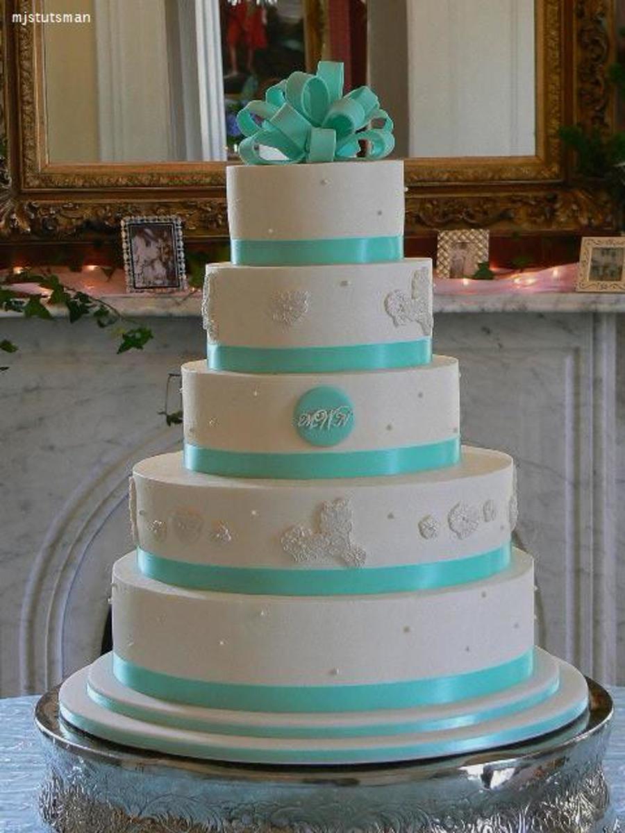 6", 8", 10", 14" and 16" cake iced with buttercream. First time making lace molds. Satin ribbon. Edible pearls. Fondant bow.