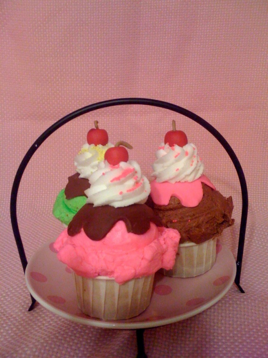 Ice cream is buttercream, sauce is fondant, whipcream is buttercream and cherry is fondant. TFL