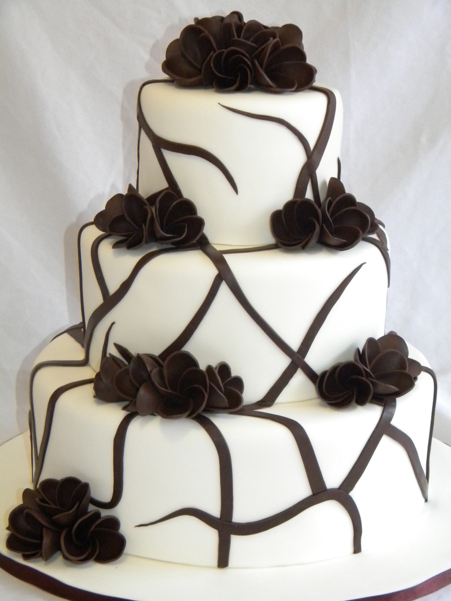 5, 8, 11" covered in white chocolate fondant with chocolate frangapanis