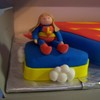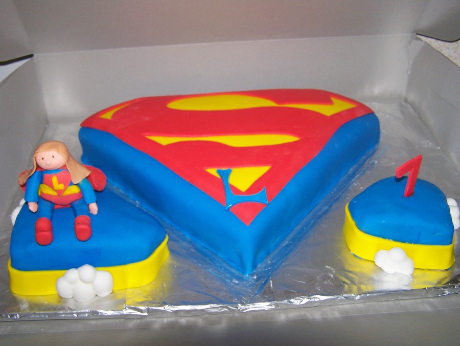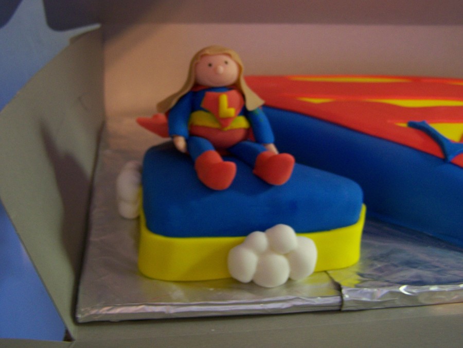 A cake I did for a friends little girl who turned 7. She wanted Superman, and an 'L' for Lily under the S. I also made a little SuperLily to go on her own personal cake, then put clouds because my son said they had to be there cause Superman flys. ~:)